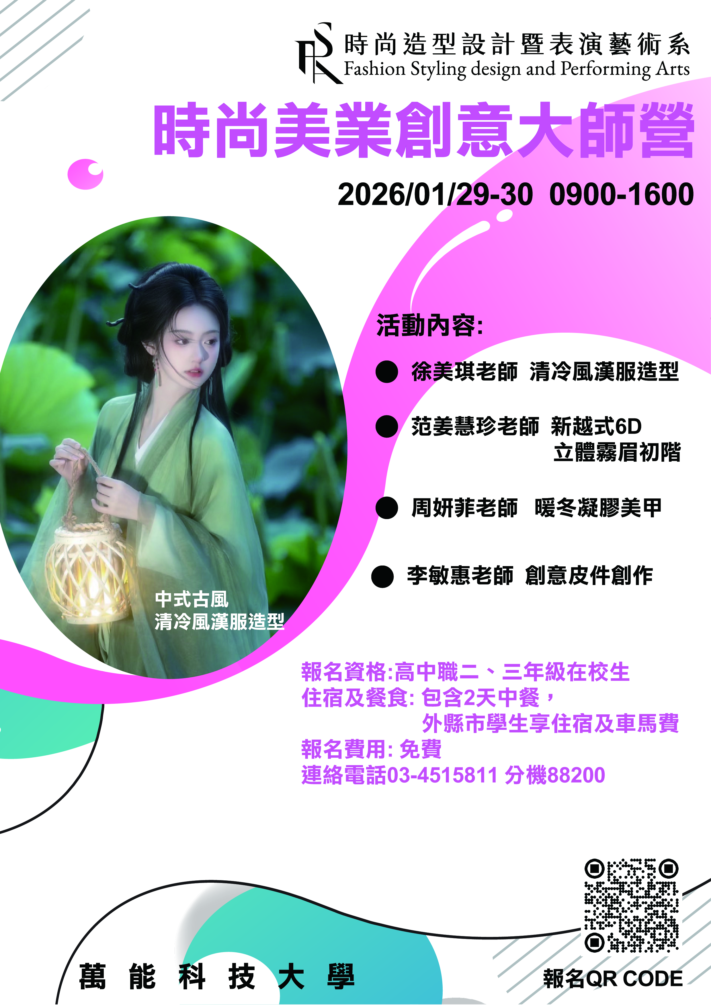 校園公告 公告主旨 「時尚美業創意大師營」及「時尚大明星訓練營」 發佈日期 2026 年 1 月 12 日 發佈單位 社團活動組 公告類別 最新消息 公告等級 點閱次數 80 公告內容 一、報名資格:高中職二、三年級在校生。 二、報名方式:即日起一律採網路報名,詳見海報。 三、日期:2026年1月29日至30日9時00分至16時00分。 四、住宿及餐食包含2天中餐,外縣市學生享住宿及車馬費。 五、活動洽詢:本校時尚造型設計暨表演藝術系,聯絡電話:03-4515811分機88200。 相關附件 時尚美美創業大師營 時尚美美創業大師營 檔案名稱檔案大小檔案格式下載時尚美美創業大師營.jpg5.32 MB新視窗開啟檔案時尚大明星訓練營.jpg6.62 MB新視窗開啟檔案 時尚美美創業大師營.jpg時尚大明星訓練營.jpg 【2026-01-12】114-2學生轉社名單(修正) 【2026-01-12】「114-2高醫科學營」線上課程資訊