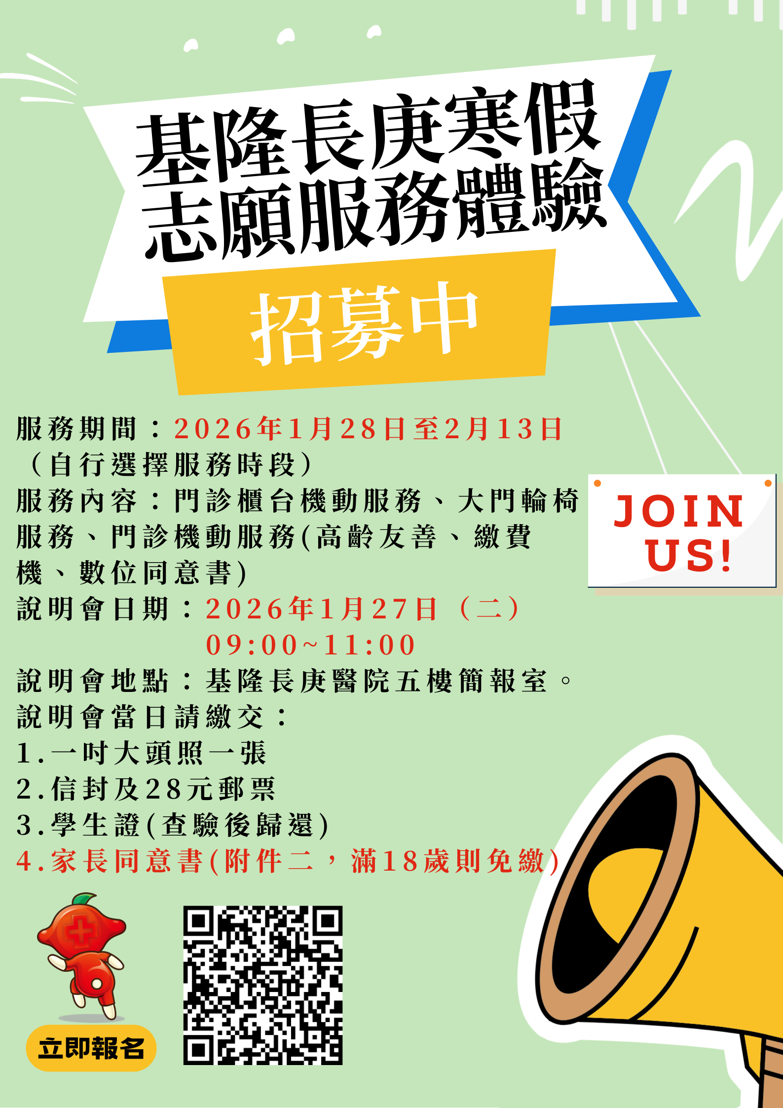 | 公告主旨 | 基隆長庚紀念醫院寒假短期志工招募訊息 |