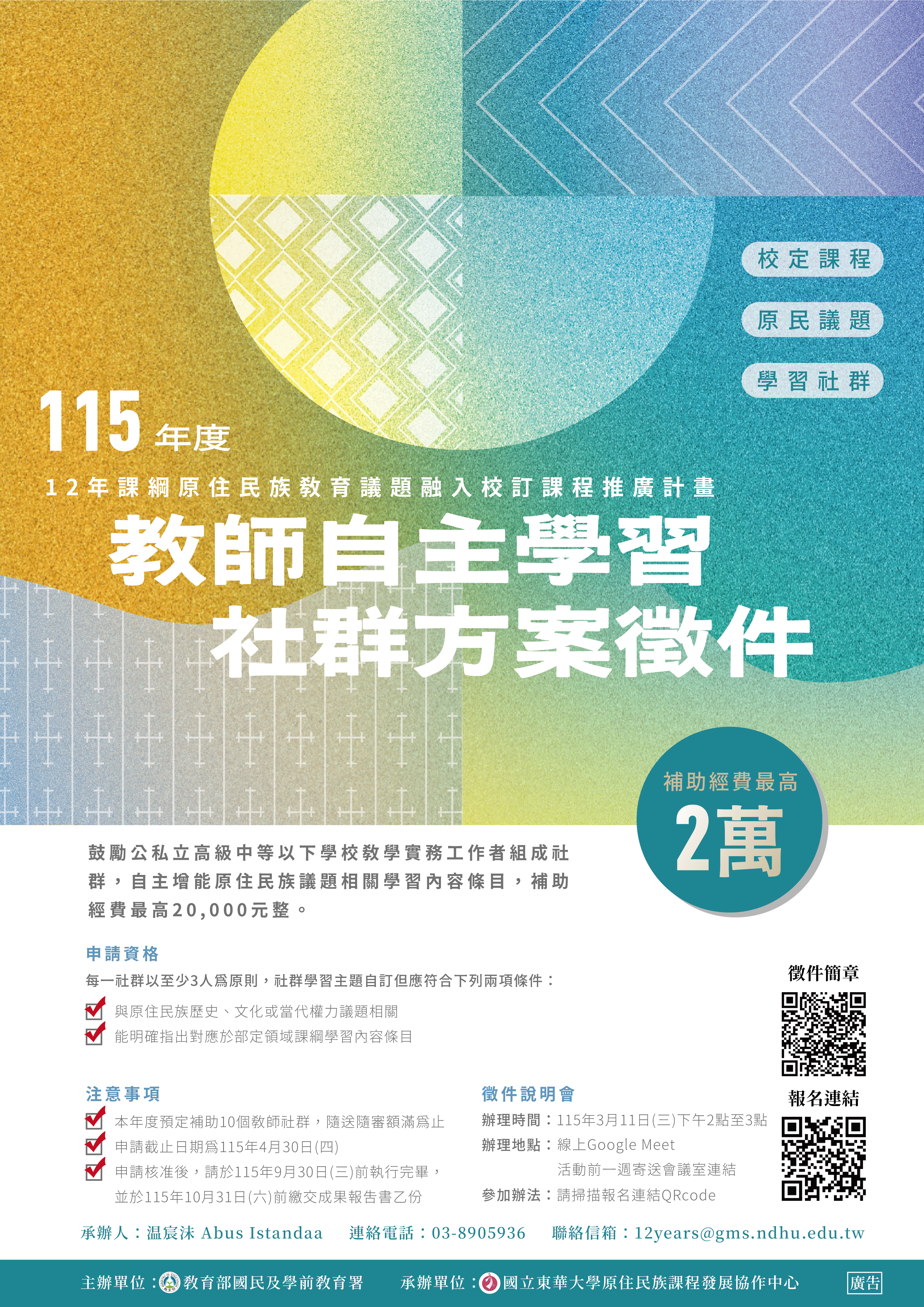 (四)申請方式:填列申請書後將資料寄至國立東華大學原住民族課程發展協作中心電子信箱(E-mail·12years@gms.ndhu.edu.(w)。