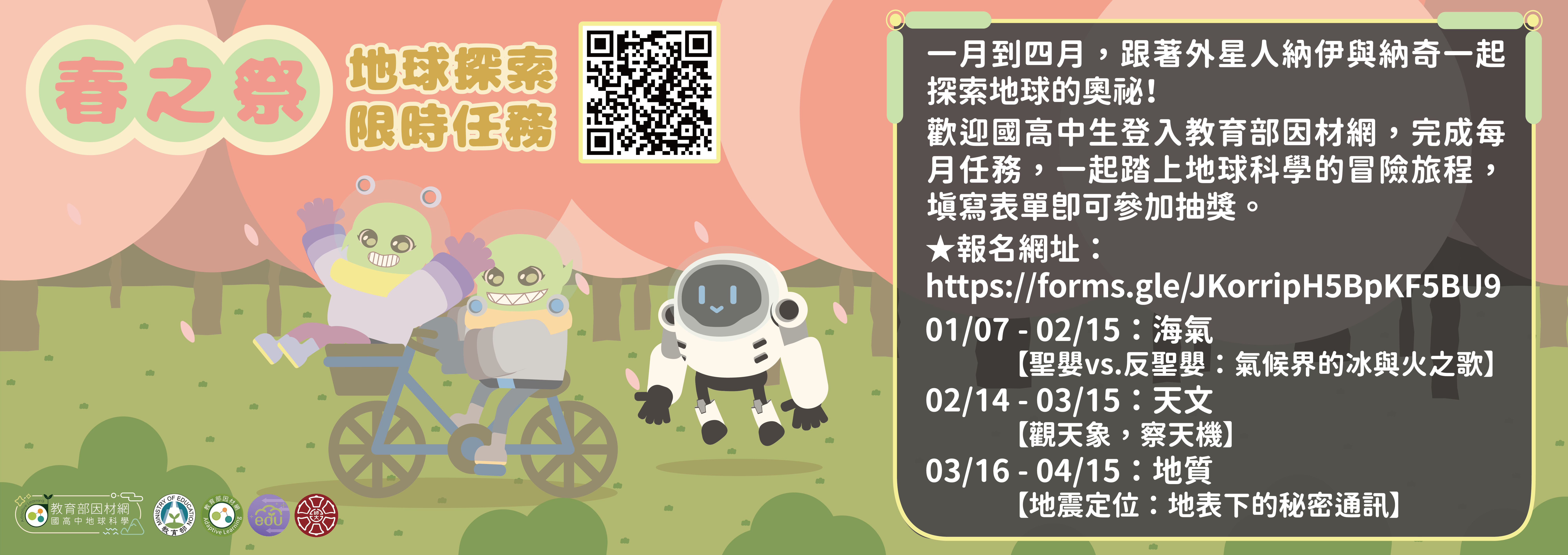 | 公告主旨 | 教育部2026年因材網地球科學跨校學習活動「春之祭—地球探索限時任務」活動資訊 |