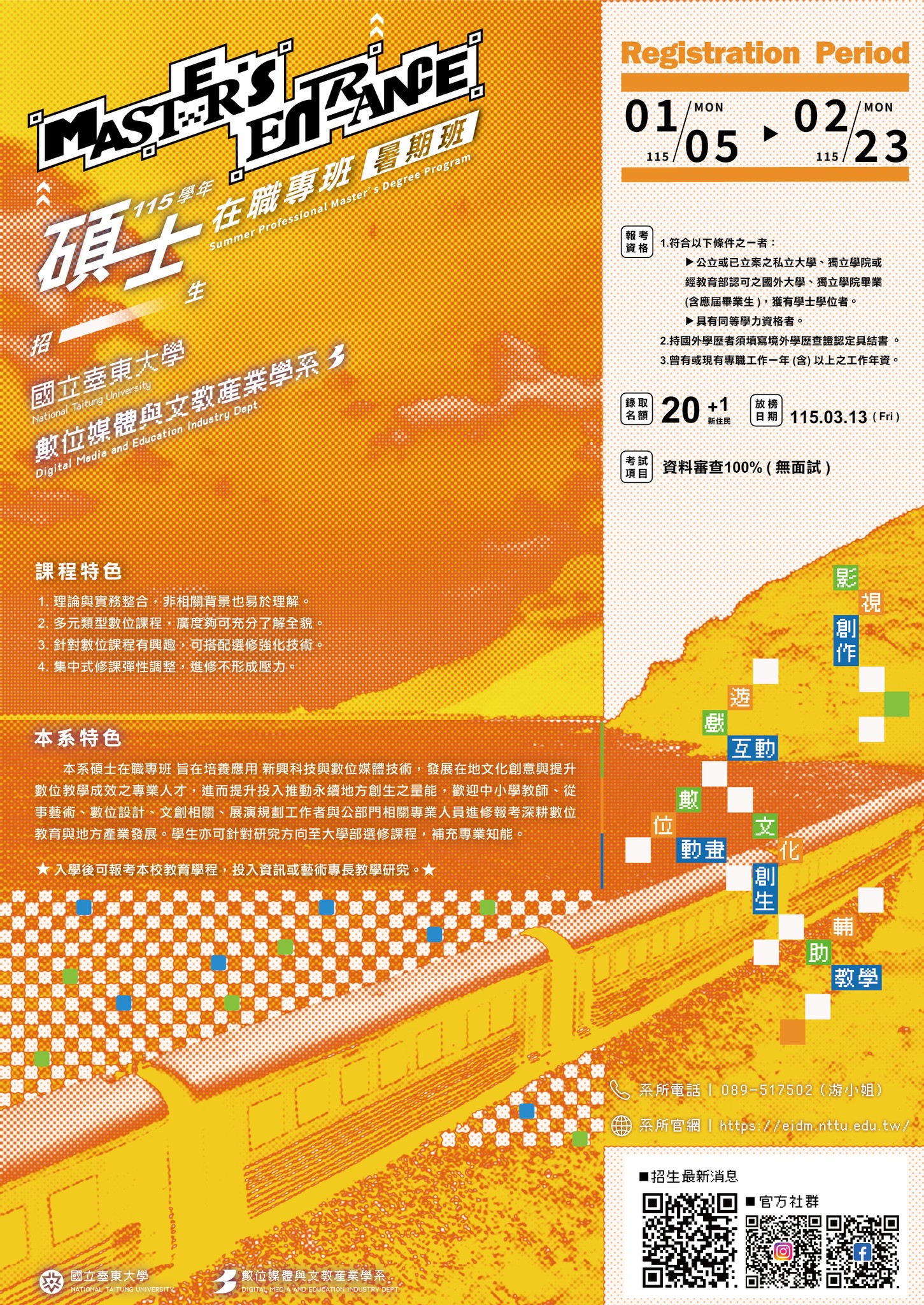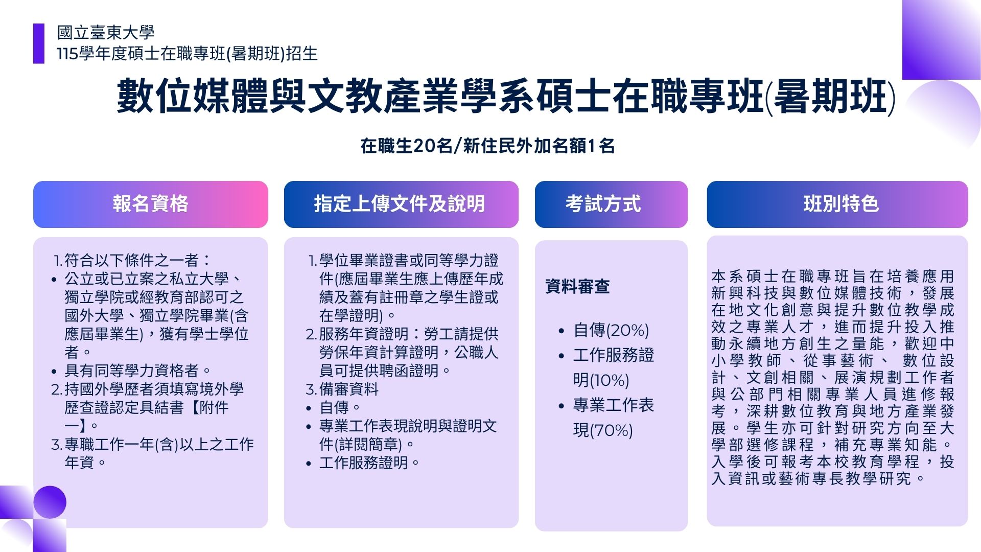 | 公告主旨 | 檢送台東大學數位媒體與文教產業學系「碩士在職專班(暑期班)」招生資訊,課程聚焦數位輔助教學與地方特色應用 |