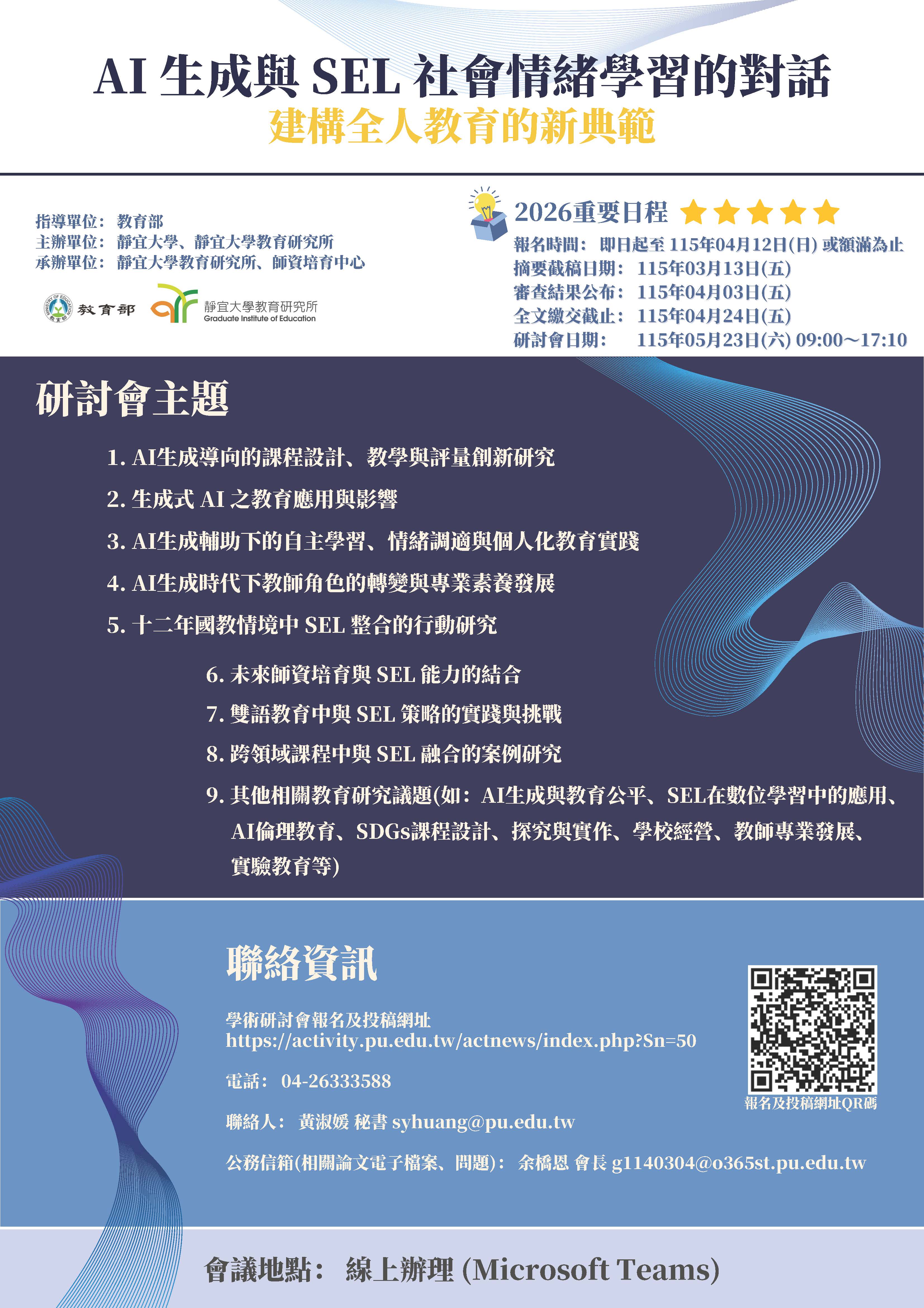 | 公告主旨 | 靜宜大學-教育研究所舉辦「AI生成與SEL社會情緒學習的 對話:建構全人教育的新典範」學術研討會徵稿相關資 訊 |