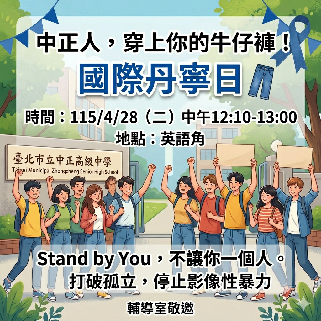 2026國際丹寧日~~ 4月是春暖花開的時間,是高三學生準備升學的時間,也是你所不知道的「性別平等月」喔。 教育部將每年4月20日訂為【性別平等教育日】,並已納入中央目的事業主管機關核定之紀念日。 每年4月最後一個週三為全球性的「國際丹寧日」,旨在呼籲民眾穿上丹寧服飾,表達支持被害者及【終止性暴力】的決心。 為什麼要穿牛仔褲呢? 因為1992年一位義大利18歲少女穿了牛仔褲第一天去駕訓班學開車,卻被45歲教練性侵害,法官居然判決加害人無罪。 此事引爆了義大利、歐洲、乃至國際的怒火,為支持受害人,民眾自發性地穿上牛仔褲上街抗議,此即為「國際丹寧日」的由來。(詳見超連結) https://www.marieclaire.com.tw/lifestyle/issue/56755 台灣近年來的黃子佼「創意私房案」、咖啡廳偷拍事件、狼醫持有大量病患私密影像等案件接連曝光,顯示偷拍行為日益氾濫,已嚴重侵害個人隱私與人身安全。 今年現代婦女基金會以「Stand by You .不讓你一個人」串聯行動,共同宣導影像性暴力防治之重要。 為響應兒童青少年保護議題,輔導室邀請中正全校師生這樣做: 4/28(二) 中午,輔導室會在英語角設置攤位與海報,請您帶著學生,一起穿著牛仔衣物,到攤位拍照打卡、喊口號。 #如果聽聞身邊有人遭到影像性暴力,或是看見新聞報導相關事件,邀請大眾採取「#停止影像性暴力_讓惡意收斂」四大行動,共同捍衛一個更安全的世界! 👂傾聽不責備:我會試著傾聽和理解被害者的處境,不評判、不責備、不嘲諷被害者。 https://www.marieclaire.com.tw/lifestyle/issue/56755 |