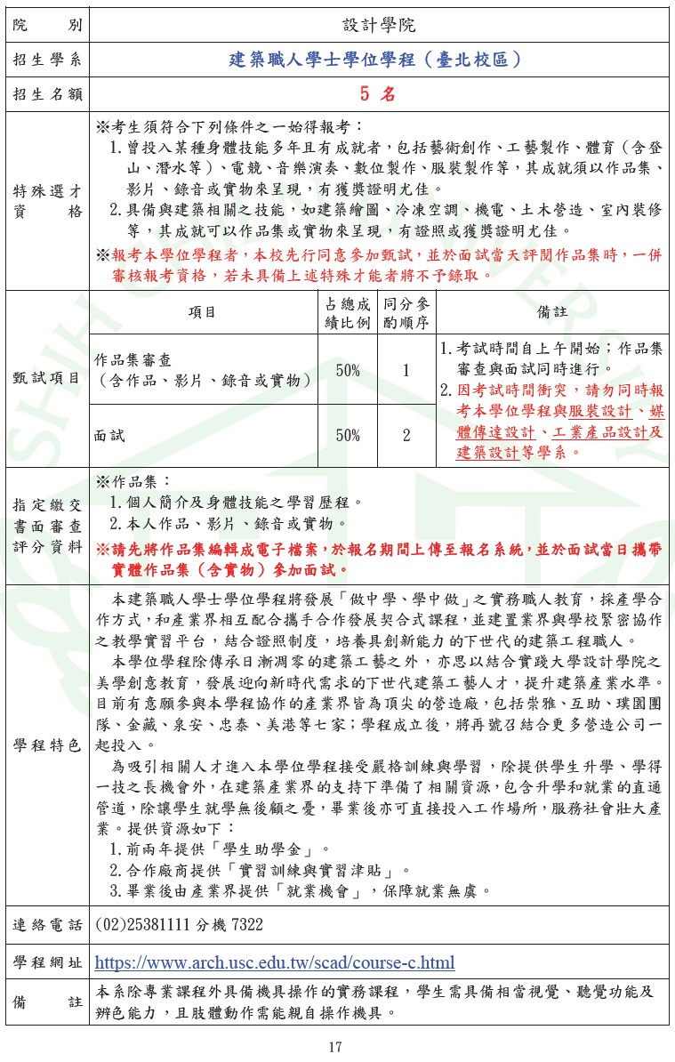 校園公告 公告主旨 實踐大學建築職人學系特殊選材之說明會 發佈日期 2025 年 10 月 31 日 發佈單位 註冊組 公告類別 最新消息, 高三升學 公告等級 轉知 點閱次數 15 公告內容 日期時間: 114年11月1號 (星期六) 下午14:00 說明會: 特殊選材招生說明會 地點: 實踐大學(台北校區) A棟 7樓 A706教室 地址: 104台北市中山區大直街70號 參加調查表 相關附件 特殊選材海報_職人定稿版 特殊選材海報_職人定稿版 檔案名稱檔案大小檔案格式下載特殊選材海報_職人定稿版.jpg5.71 MB新視窗開啟檔案 特殊選材海報_職人定稿版.jpg 115年特殊選材招生簡章公告版(職人) 115年特殊選材招生簡章公告版(職人) 檔案名稱檔案大小檔案格式下載115年特殊選材招生簡章公告版(職人).jpg291.98 KB新視窗開啟檔案特殊選材期程表.jpg207.21 KB新視窗開啟檔案 115年特殊選材招生簡章公告版(職人).jpg特殊選材期程表.jpg 【2025-10-31】「奇鋐科學獎」 【2025-10-31】「數位/網路性別暴力」及「跟蹤騷擾防制」宣導素材