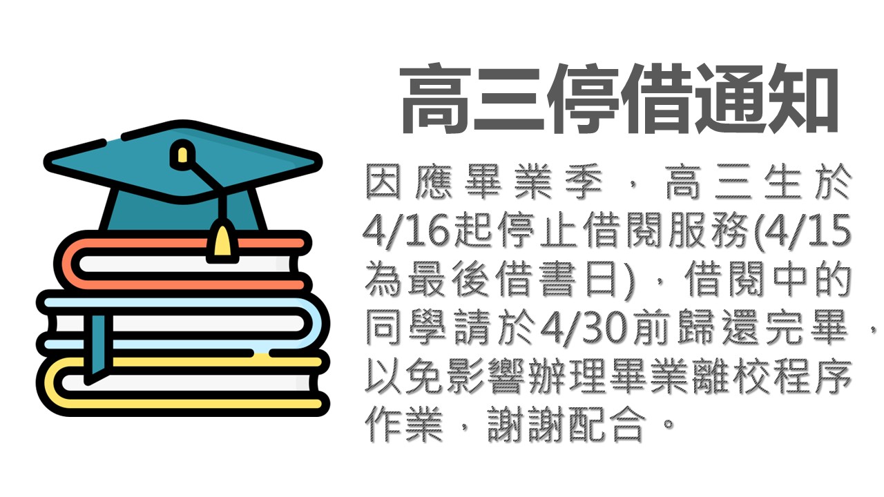| 公告內容 | 因應畢業季,高三生於4/16起停止借閱服務(4/15為最後借書日),借閱中的同學請於4/30前歸還完畢,以免影響辦理畢業離校程序作業,謝謝配合。 |